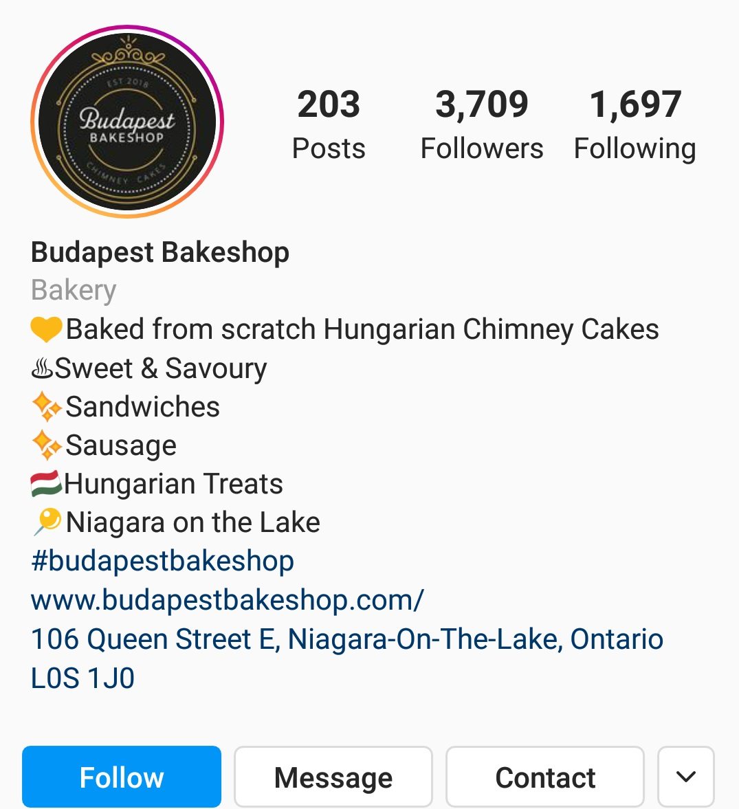 Here’s an example from Budapest Bakeshop. Their Instagram page talks about what they do and offers, clearly mentions the address, links to their website, and uses their branded hashtag #budapestbakeshop