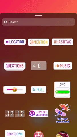 Tap any icon (i.e. Countdown, Quiz, Templates), now tap the screen to view next; if you have found something you like, tap on its dedicated icon and in the next screen, you can personalize and edit that sticker.