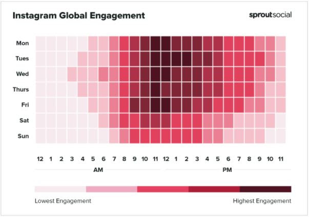 If we look at Sprout Social’s global engagement data, it’s clear that Monday through Friday at 11:00 a.m. (and to some extent 12:00 noon) are the best slots for posting on Instagram.