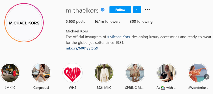 Let’s take a look at the official Instagram page of Michael Kors. Note that the company added its branded hashtag, #MichaelKors, to the bio.