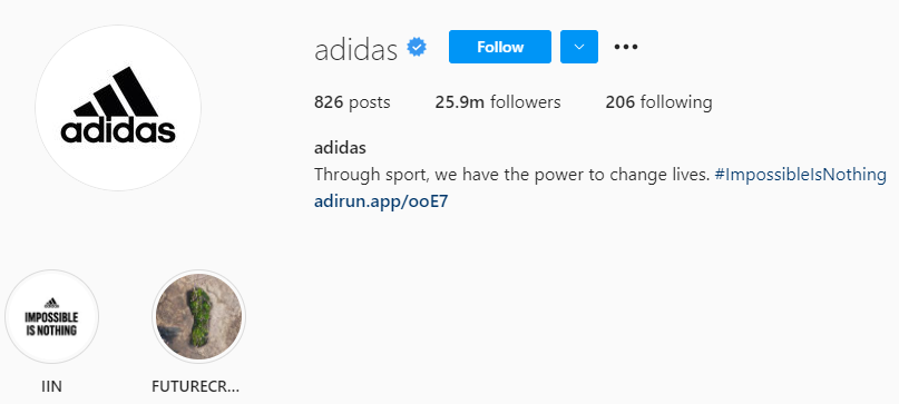 Another interesting example is from Adidas, which obviously believes its bio is best reserved for its campaign hashtag, #ImpossibleIsNothing.