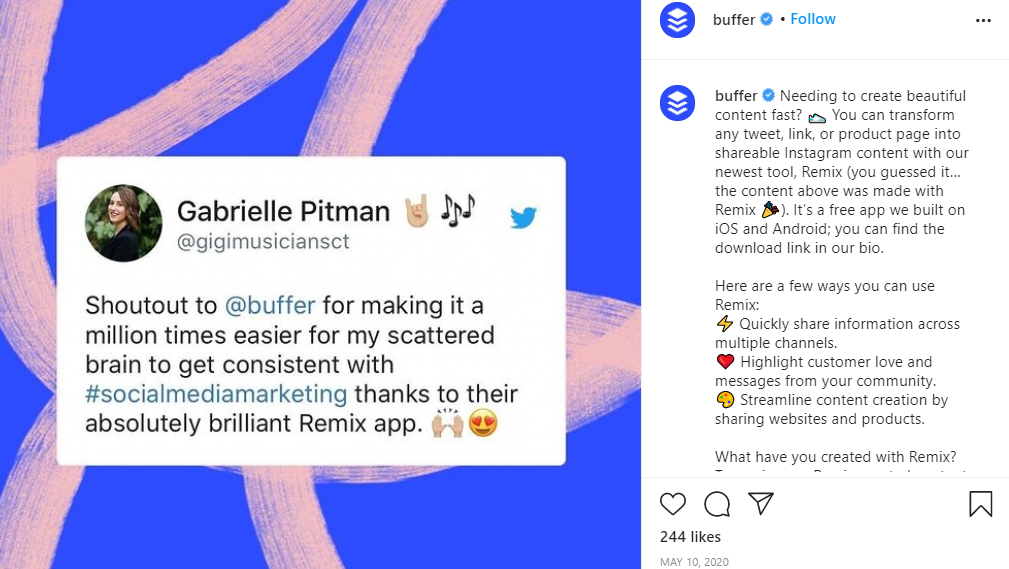 Here Buffer is promoting a tool feature by sharing positive feedback from one of their happy users: