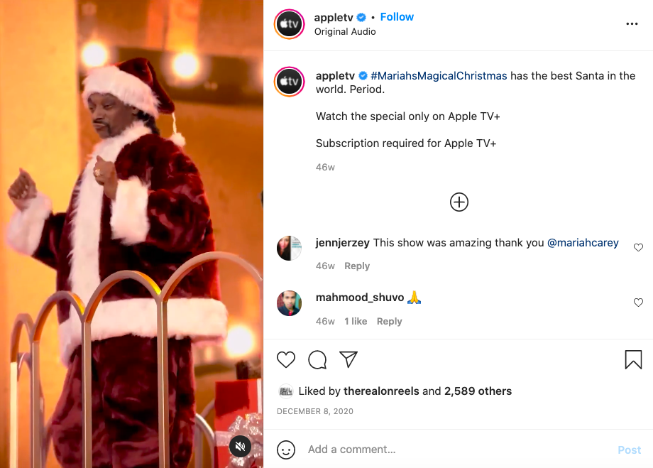 Apple TV seamlessly integrated a call to subscribe into their seasonal content by using an image of Snoop Dogg from Mariah Carey’s Christmas special and letting everyone know they can stream it on their app.