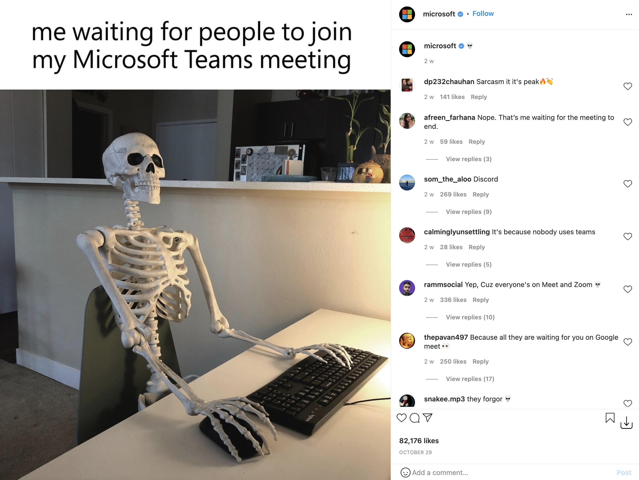 Microsoft posted memes on Instagram for Halloween that are funny, seasonal, and promote Microsoft Teams.