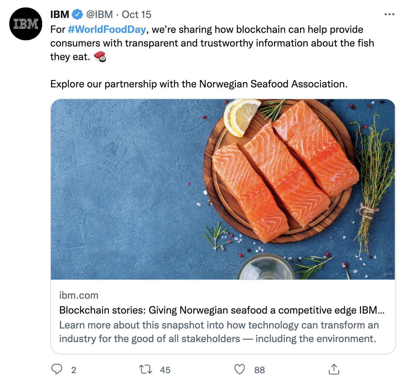 IBM tweeted an intriguingly informative post for World Food Day. The company used a seasonal hashtag to reach new accounts and posted a relevant article to drive traffic to the IBM website.