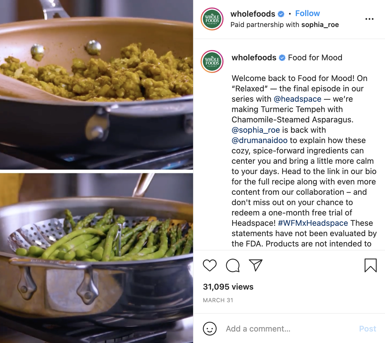 For an audience interested in a healthy lifestyle, Whole Foods Market delivers content that combines physical and mental well-being. The caption speaks to people who want to use food to boost their mood and to feel more relaxed. The copy communicates the benefits of this recipe (desire), giving followers a reason to watch the video and head to the website for the full recipe (action).