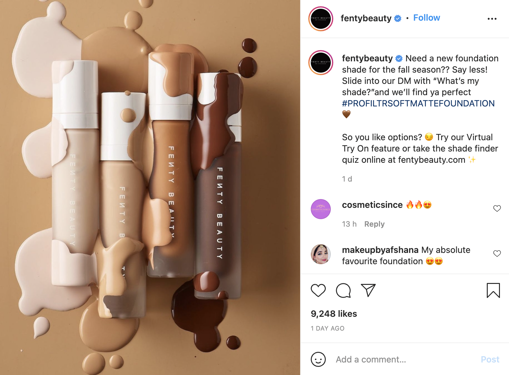Fenty does a great job of identifying a customer pain point: not knowing what shade of foundation is a good match for one's complexion. They've used the change of season as a lead-in, and after communicating a pain point, provided a very clear solution: DM them for the answer!
