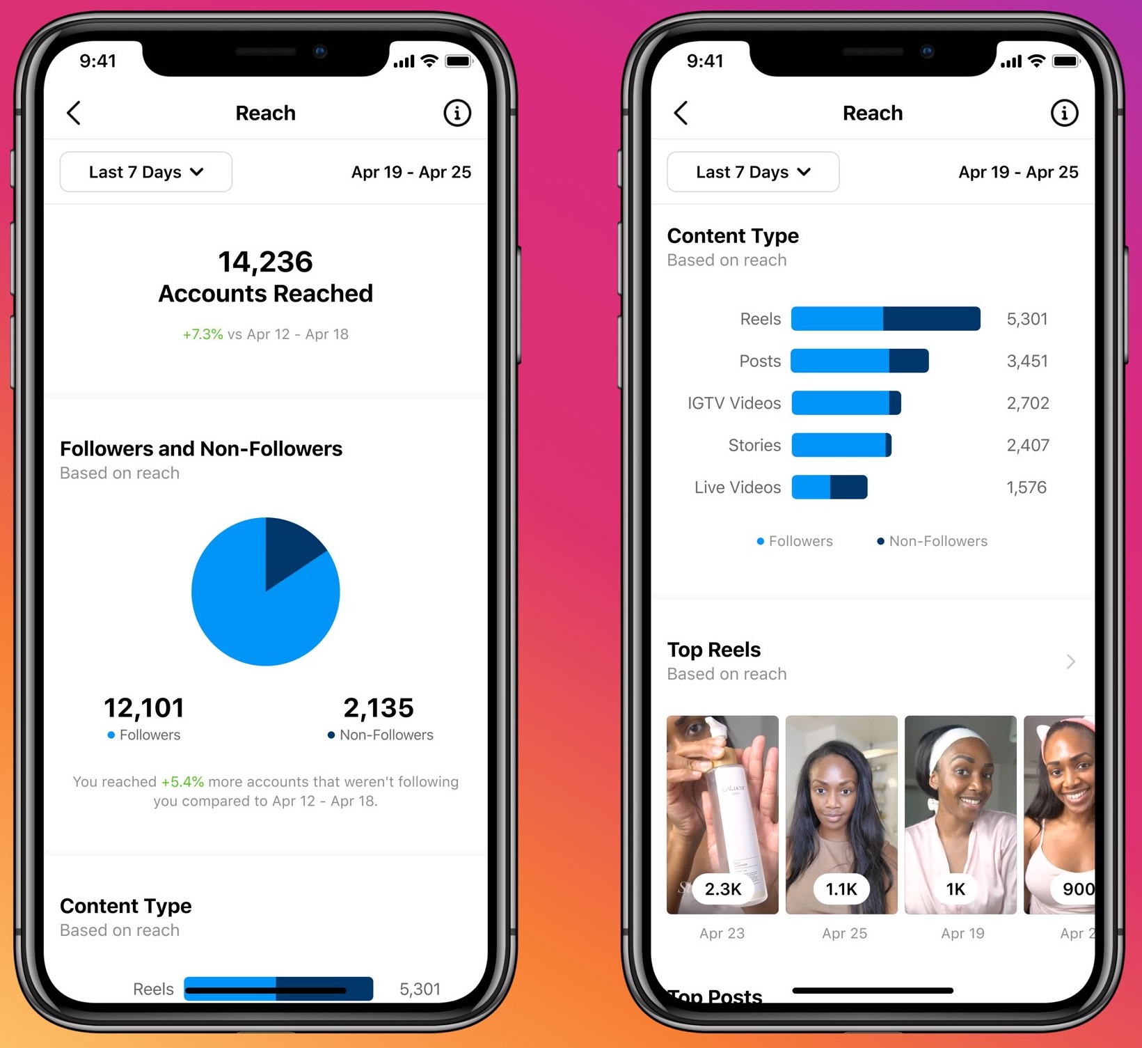 With the help of Reels and Live data, you'll have a better idea of which type of content is gaining more traction for you by giving you more engagement and follows.