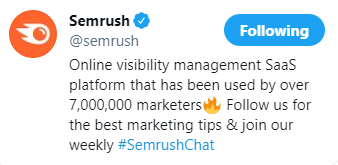 1. Use hashtags you want to promote or popularize in your profile. Let’s take a look at Semrush’s Twitter profile description and their campaign hashtag #SemrushChat: