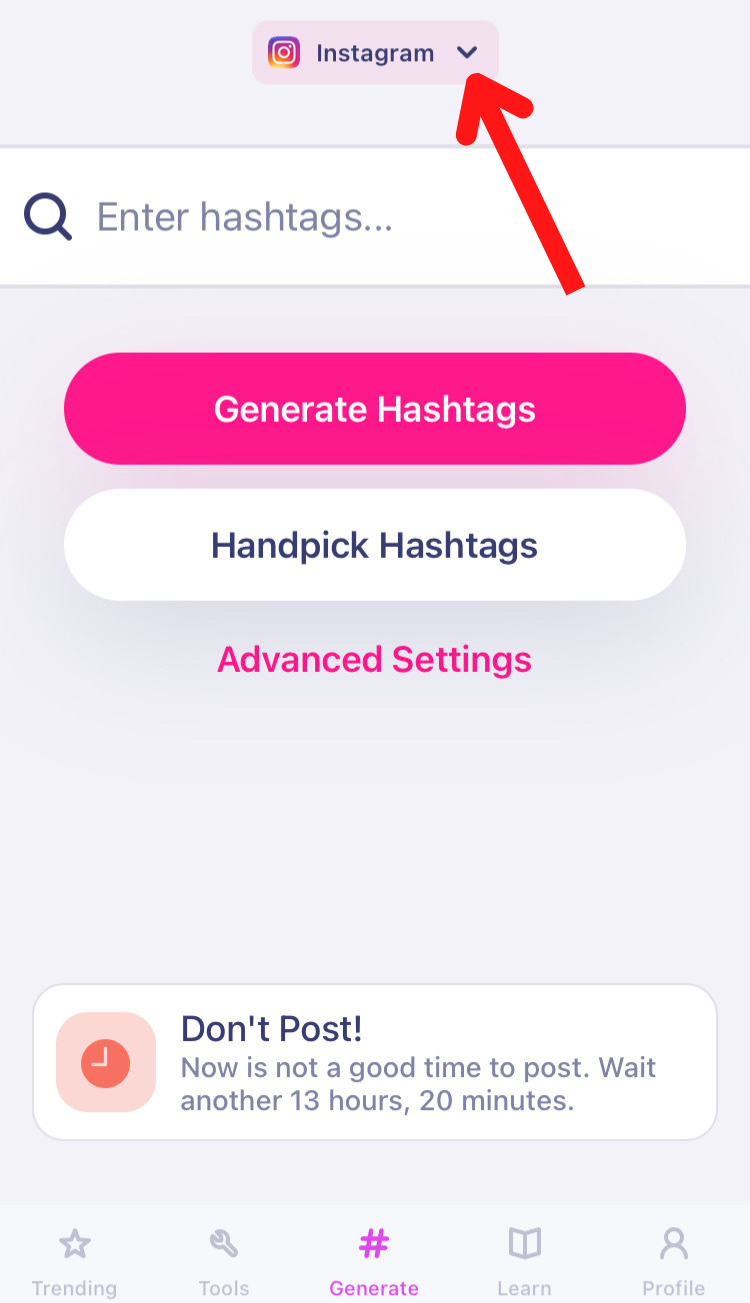 Instagram is the default social channel. If you want to generate hashtags for Reels, Stories, TikTok, or any other social media, tap the down arrow at the top of the screen and tap on your preferred social media icon.