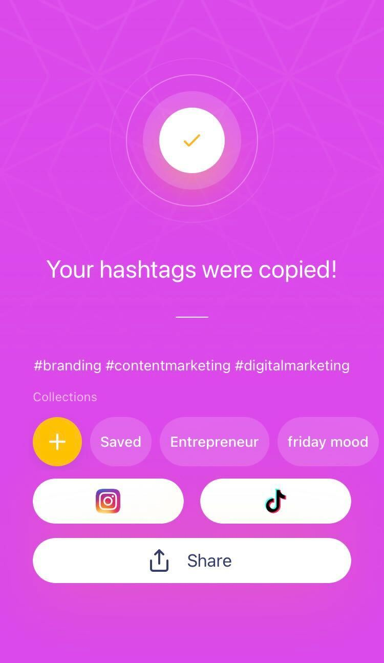 When you’re done, tap to copy hashtags. Next on the confirmation screen tap the Instagram or TikTok icon to open the app and paste on to your post.