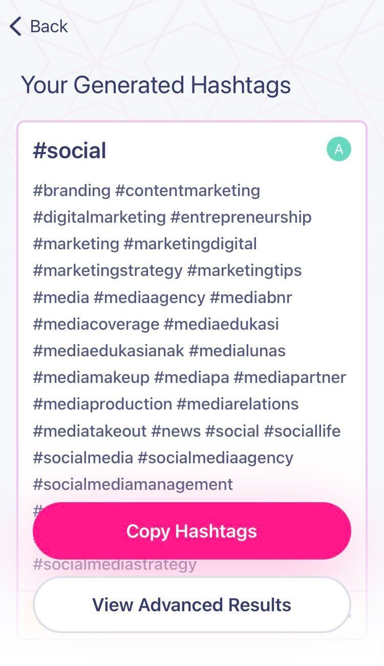 On the hashtag results page, you’ll notice two buttons. One for copying hashtags, the other to view advanced results.