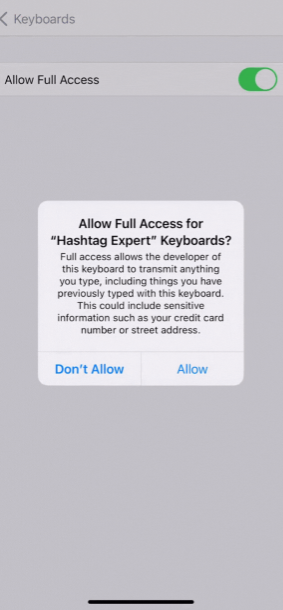 Step 4: The Hashtag Expert keyboard will not function without being given full access. You have to Allow Full Access so that we can easily access hashtag groups you created and saved in your Hashtag Expert app.