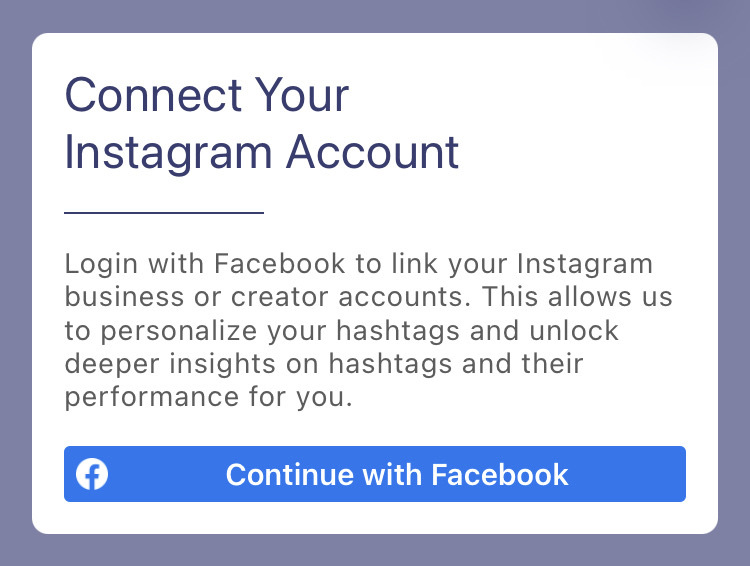 If you haven't added your Facebook or Instagram, you'll be prompted to do it here. By connecting your creator or business account with Hashtag Expert, you'll get more personalized hashtag suggestions and deeper insights.