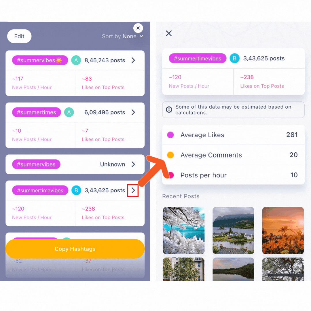 Tap the arrow key beside each hashtag; in the next page, you'll be able to view: