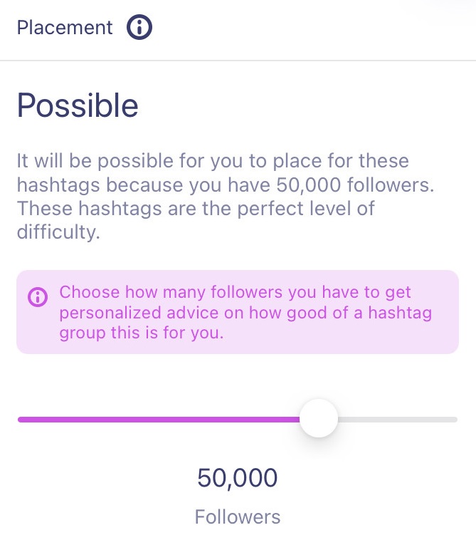 This is the most valuable piece. Based on your follower count, we’ll come up with a conclusion about your odds of performing well with a group of hashtags - Possible, Hard, Very Hard, and Extremely Hard. Then, you'll see a detailed explanation of how we came to that conclusion.