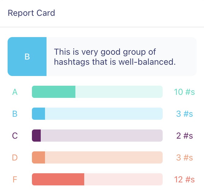 The hashtag stats section is a combination of multiple cards, each with information about individual hashtags from that group.