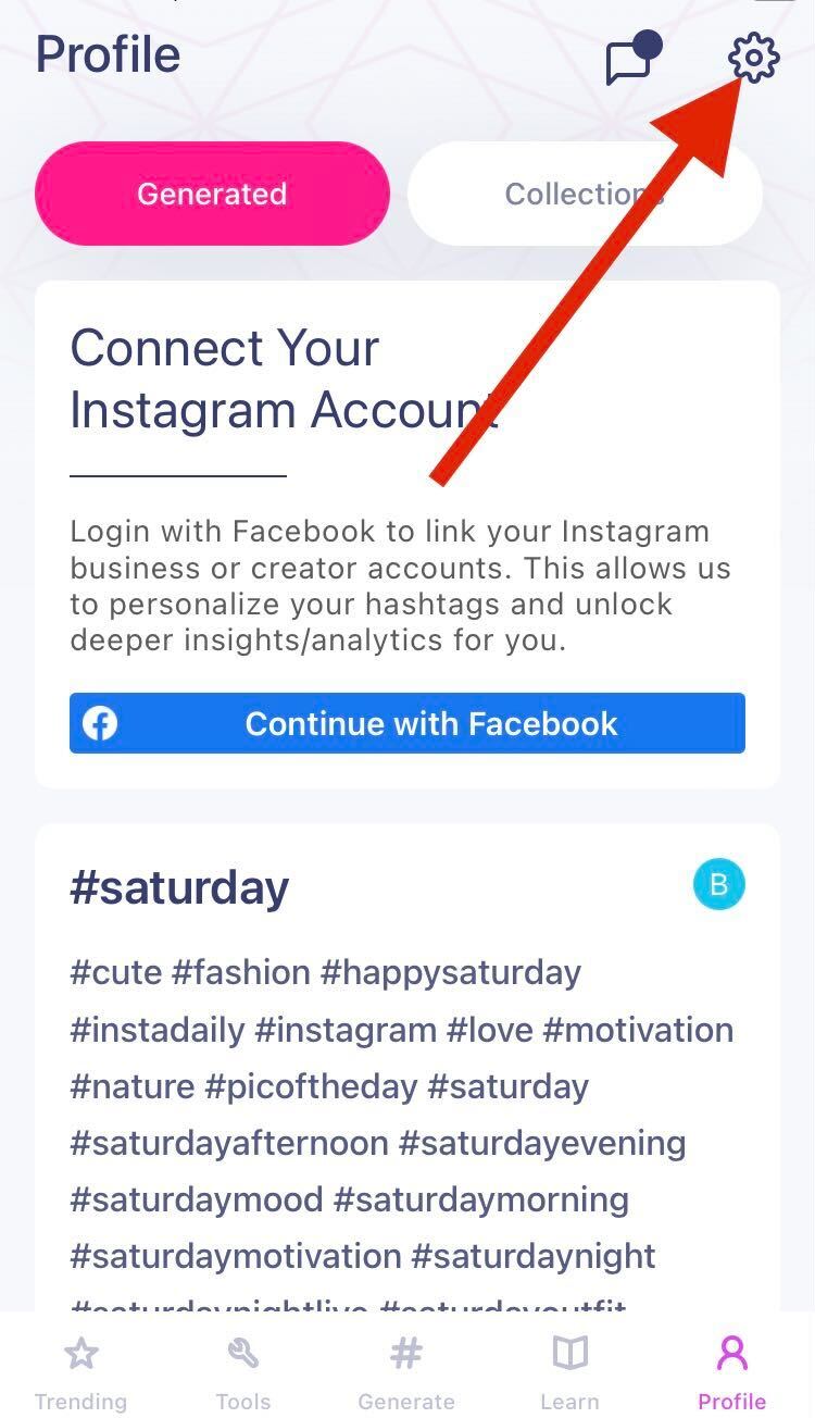 On the Hashtag Expert app, you’ll notice the 'Profile' tab at the bottom panel, next to the 'Generate' tab. Consider this your home base or personal workspace.