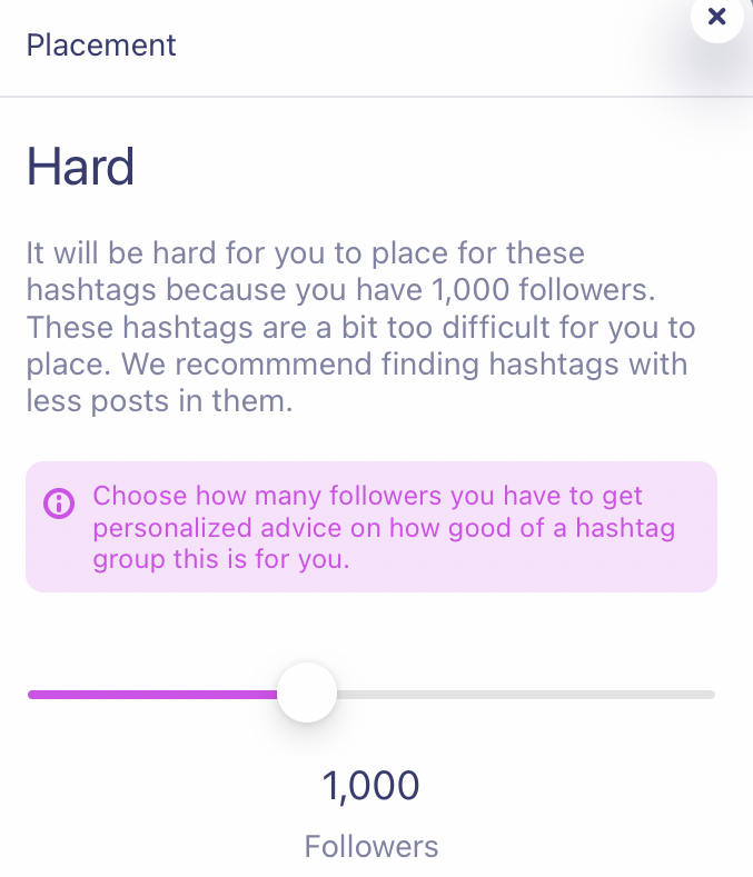‘Placement’ is one of the algorithms we use to give our users a personalized estimate of hashtag reach. Simply put, it tells you about the likelihood of achieving higher organic views and engagement for your profile if you use a particular group of hashtags. So you see either of these indicators: