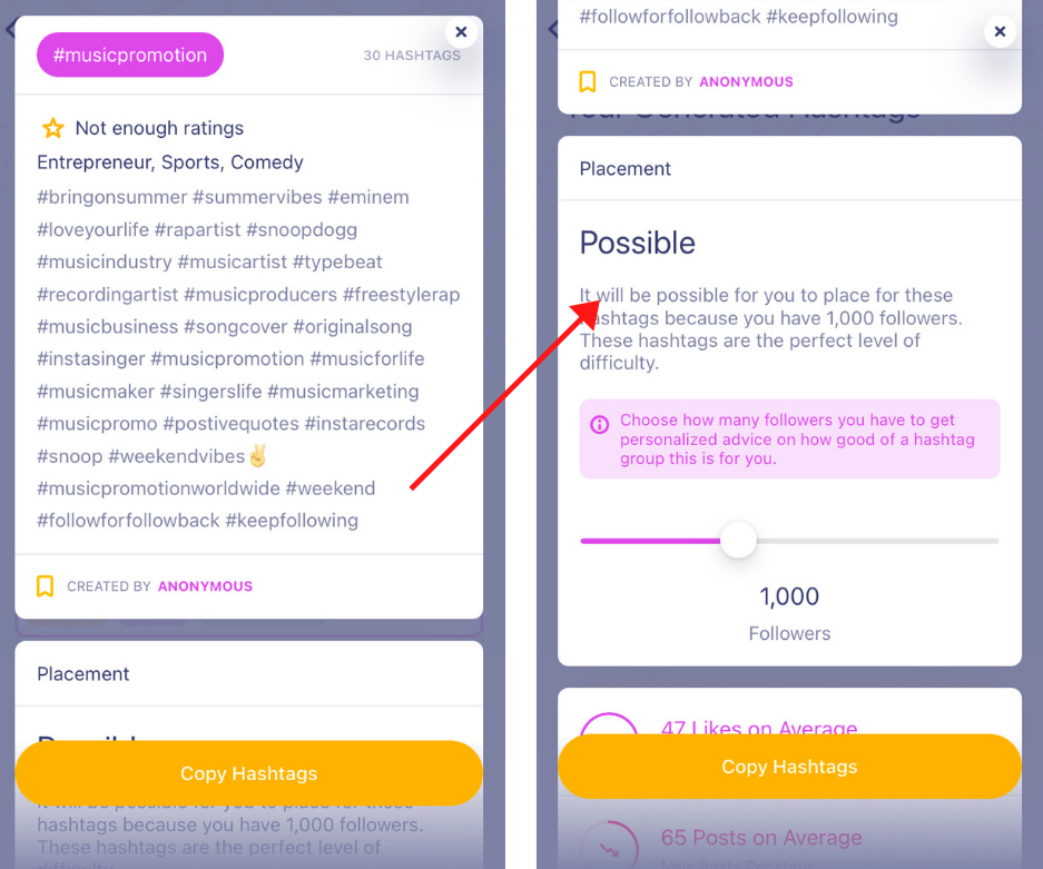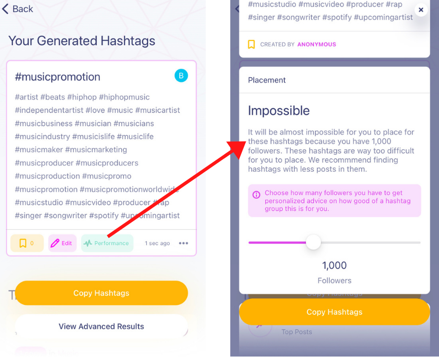 Say for example, you found an excellent group of trending hashtags but our AI says due to fewer followers, it’s ‘Extremely Hard’ for your page/profile to generate likes and views on Instagram.