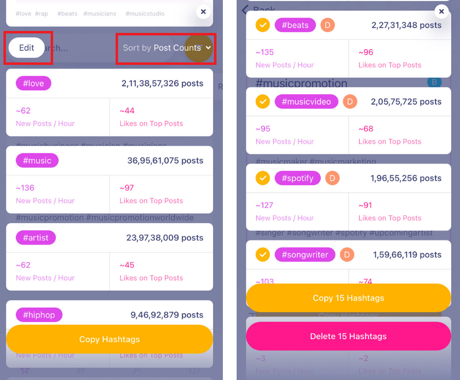 Scroll down until you see the ‘Edit’ button. Now sort hashtags by post counts and tap ‘Edit’. Tap to select hashtags with too many post counts. Now tap Delete ‘x’ Hashtags.
