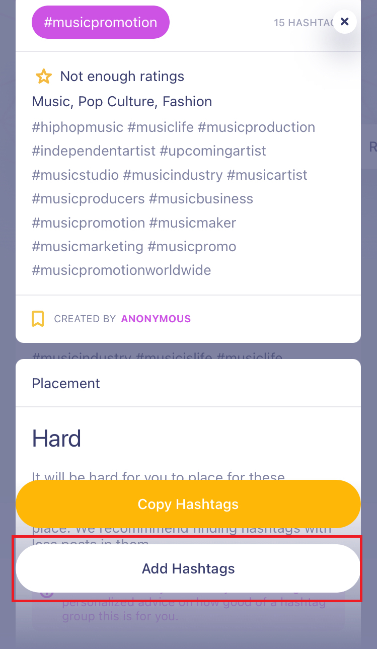 Or, you may find and add more hashtags to make the total number 30. This step is useful especially if your placement data is still ‘Hard’, as it is in our case (see image below).