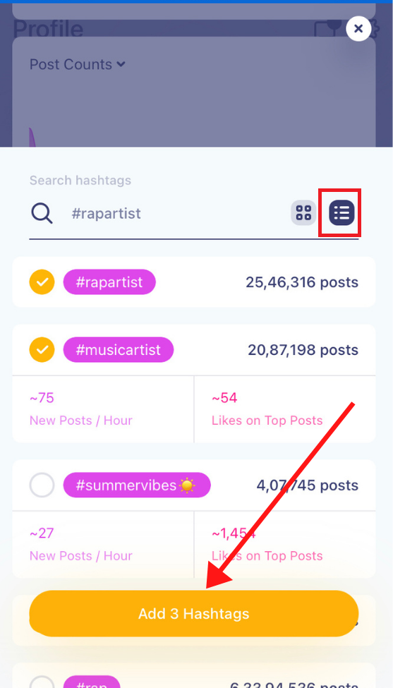 Now type a base hashtag, tap ‘Search’ on your keypad. Choose the view by post count so that it’s easy for you to only add hashtags you can easily target. Tap to select hashtags and when you’re done, add those hashtags to your existing group.